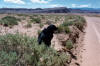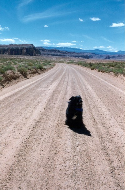 Melanie attesting to the low traffic count on the lower cathedral valley road on the San Rafael Swell, Utah (May 26, 1997) |