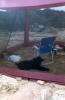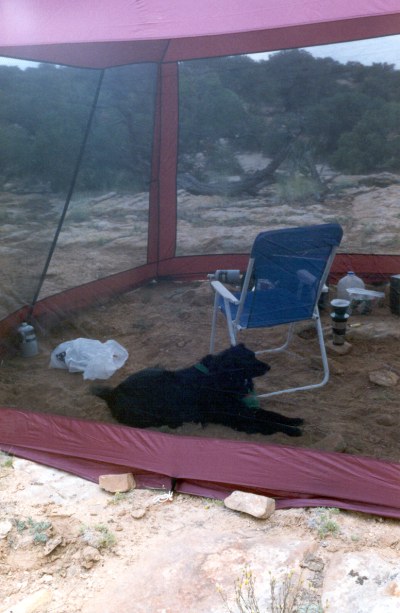 The bugs (nats) were really bad on this trip. So, Melanie enjoys the afternoon in the comfort of her screened sunshade (June 1997) |